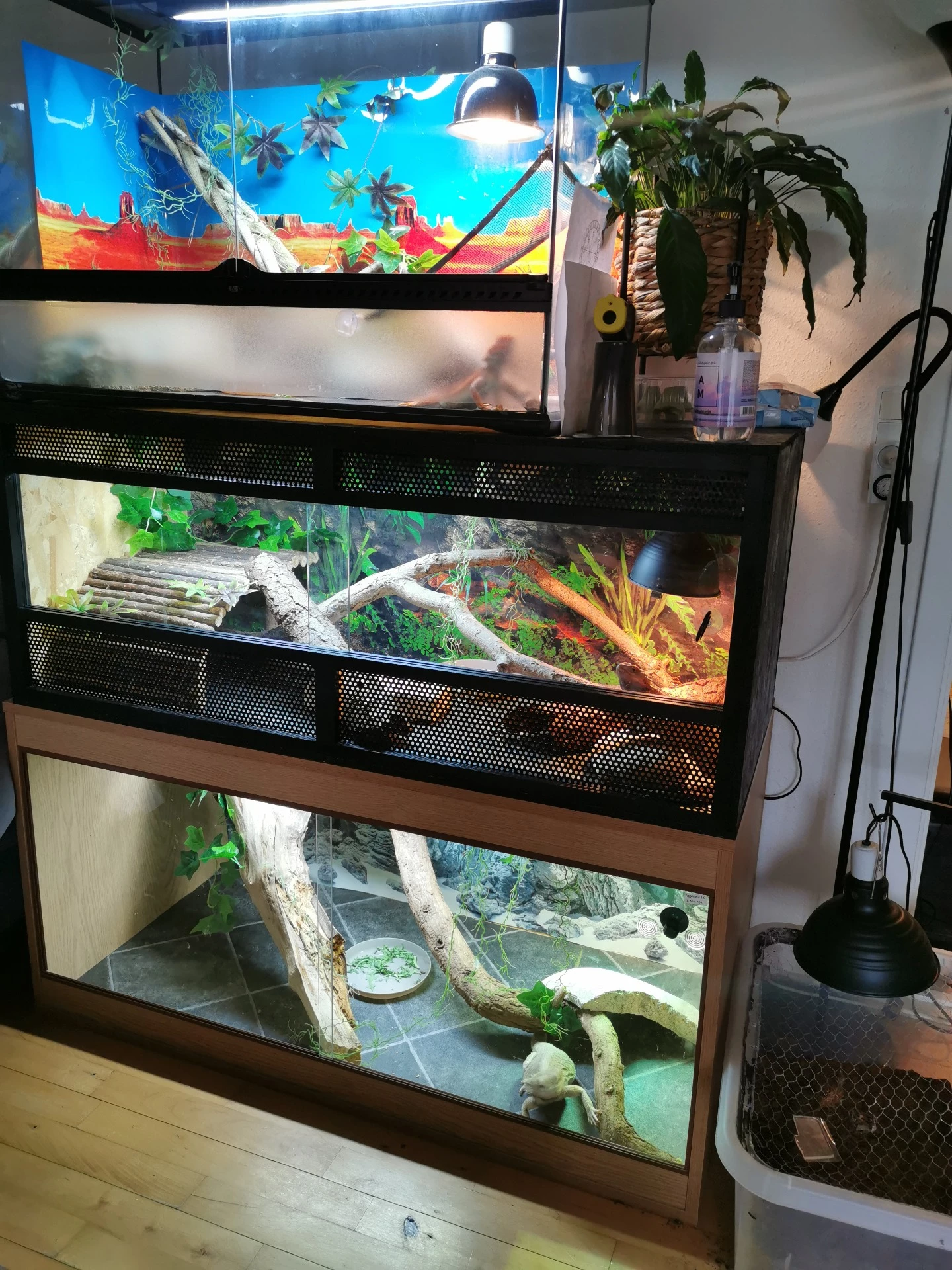 Anbefalet terrariemål er 120x60x60, og de kan fås i både glas eller træ. (er du handy, så kan det laves selv) disse kan dog være svære at finde på markedet, så 120x50x50 kan gå an, men her er der vigtigt at de også kommer ud og får brugt sine muskler.
