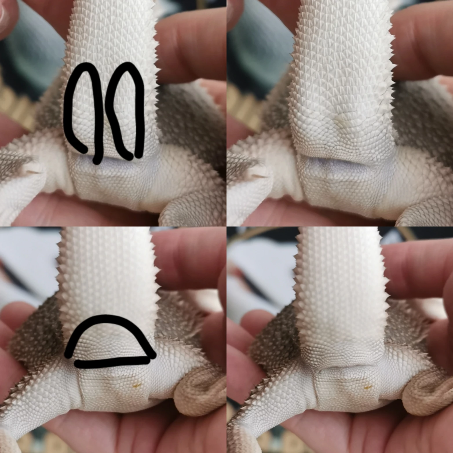En metode du kan bruge for at se forskel på kønnet, er ved at have din skægagame stående på alle 4 ben i vandret position, hvor du bukker halen opad. Så vil der komme 2 lodrette buler til syne ved haleroden, hvis det er en han, og en halvmåne, hvis det er en hun.